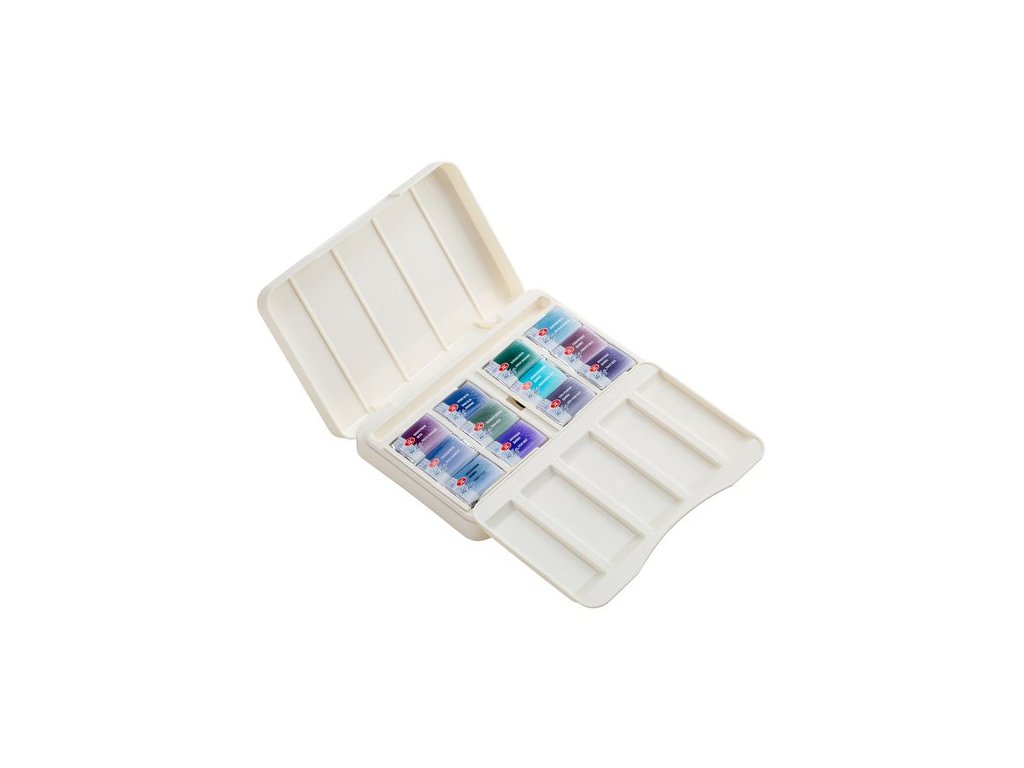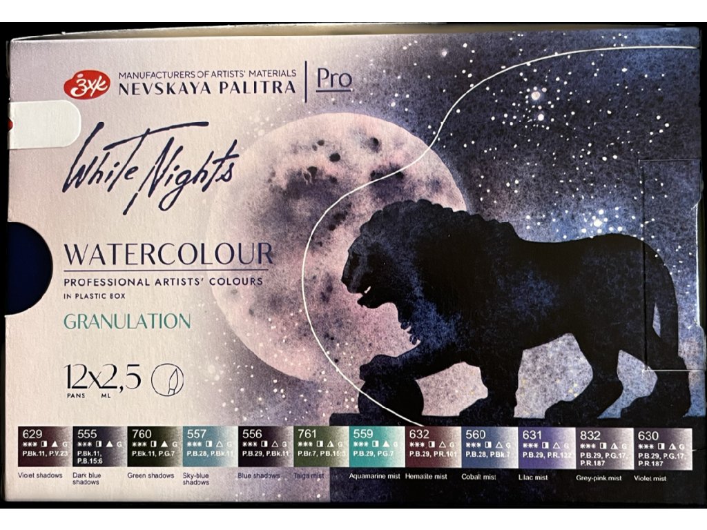 Paleta sady akvarelů "White Nights" Granulace v plastovém pouzdře se skládá z 12 granulačních odstínů.