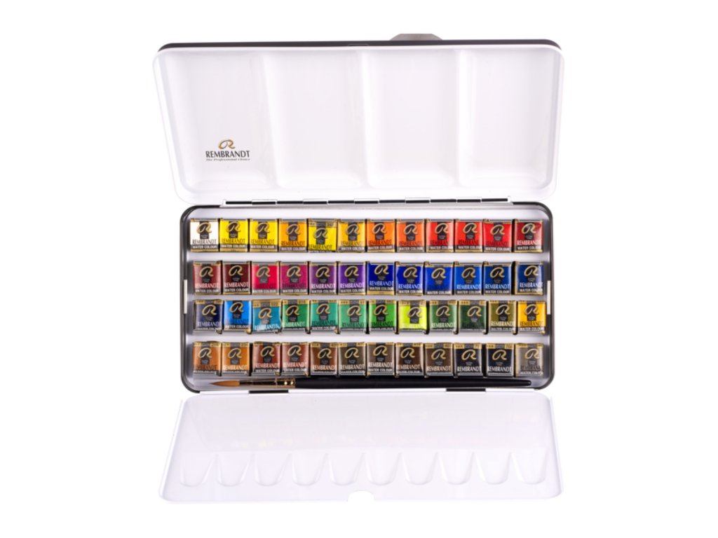 Opaque white (106), Cadmium yellow lemon (207), Cadmium orange (211), Yellow ochre (227), Raw sienna (234), Gamboge (238), Aureoline (242), Azo yellow light (246), Azo yellow deep (248), Transparent oxide yellow (265), Cadmium red (305), Cadmium red deep (306), Vermilion (311), Carmine (318), Permanent madder lake (336), Venetian red (349), Perylene red deep (354), Quinacridone rose (366), Transparent oxide red (378), Vandyke brown (403), Burnt umber (409), Greenish umber (410), Burnt sienna (411), Sepia (416), Transparent oxide umber (417), French ultramarine (503), Ultramarine deep (506), Prussian blue (508), Cobalt blue (511), Turquoise blue (522), Mauve (532), Cerulean blue (534), Blue violet (548), Permanent red violet (567), Phthalo blue greenish (576), Phthalo blue reddish (583), Indanthrene blue (585), Emerald green (615), Viridian (616), Olive green (620), Sap green (623), Hooker green deep (645), Permanent green (662), Chromium oxide green (668), Phthalo green (675), Ivory black (701), Payne's grey (708), Neutral tint (715).
