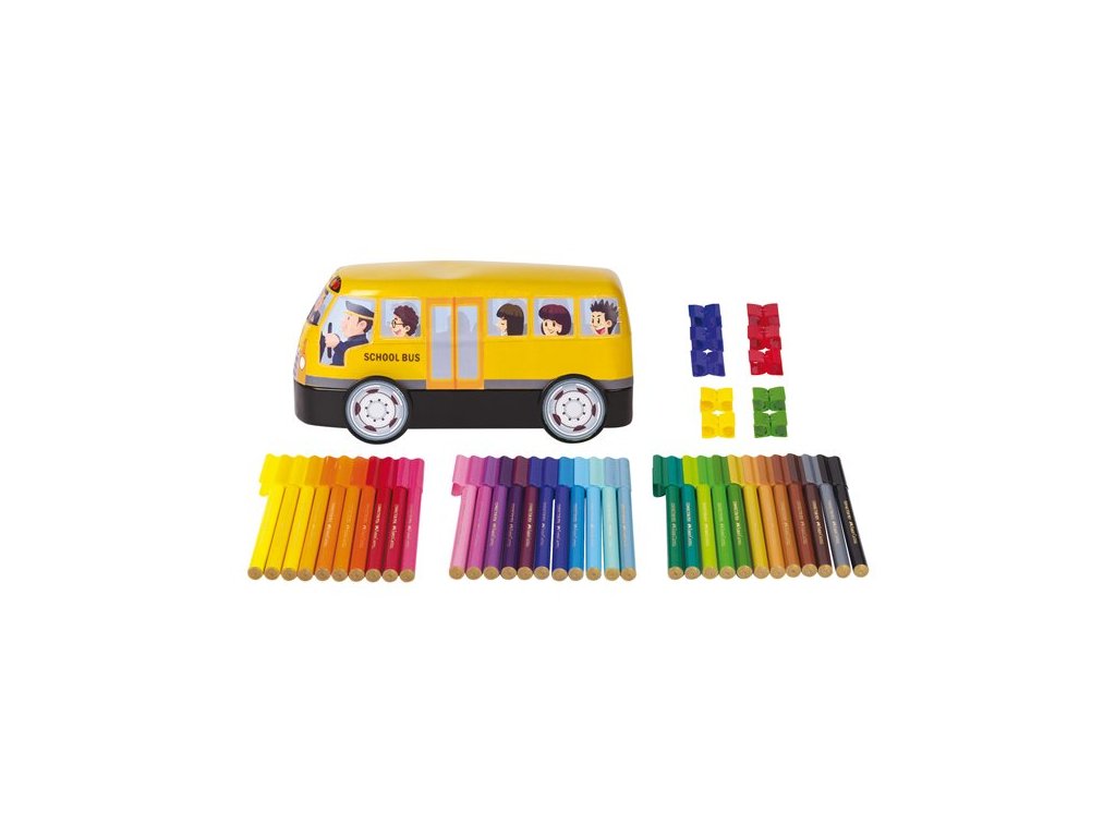 Souprava 33 kusů fixů různých barev se spojovacími klipy v dárkové plechové dóze ve tvaru autobusu.