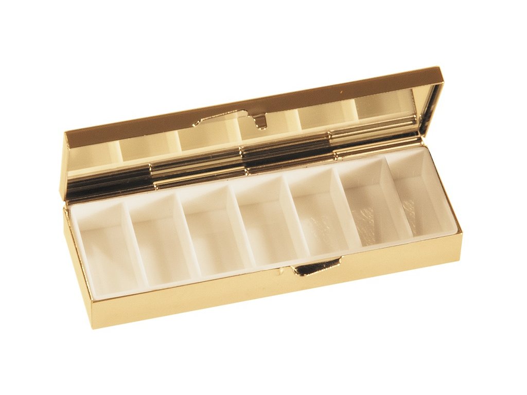 Kovová dózička na léky s pantem. Uvnitř s dělenou plastovou vložkou a zrcátkem.