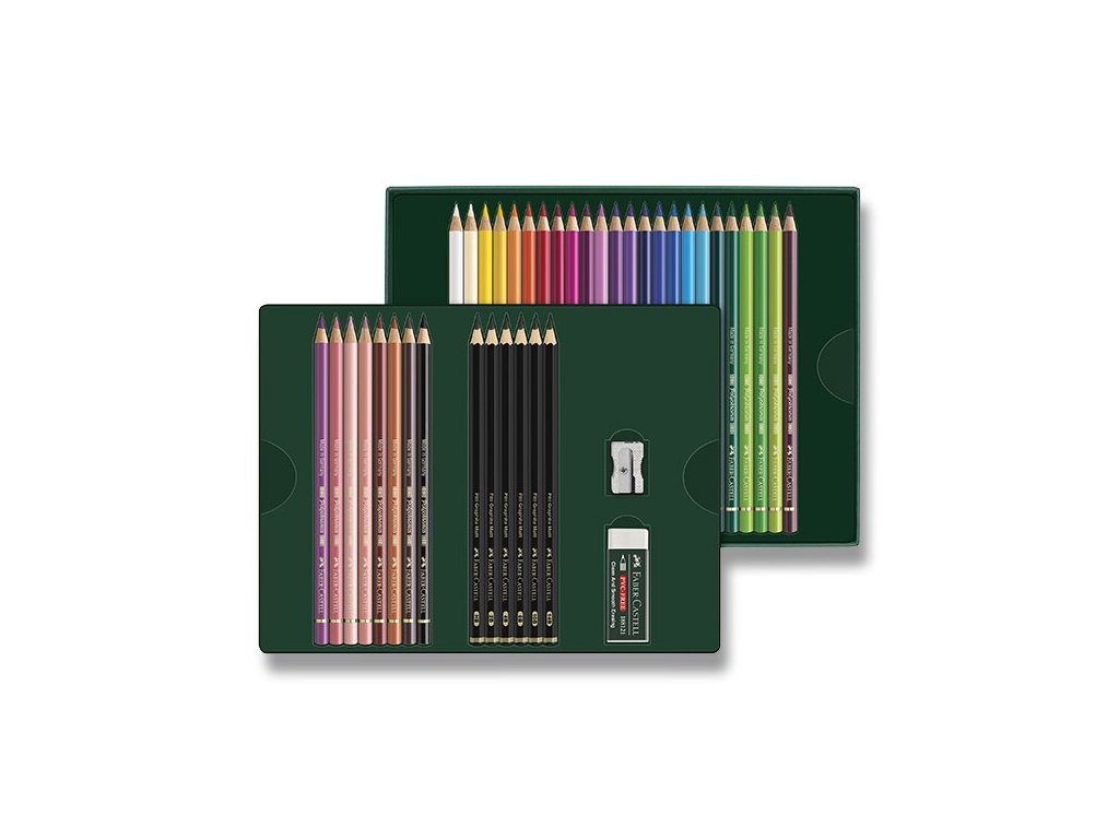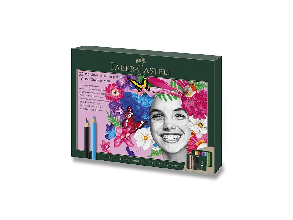 Sada 32 kusů vysoce kvalitních dřevěných uměleckých pastelek Polychromos značky Faber-Castell, 6 ks uměleckých grafitových tužek Pitt Graphite Matt, pryže a ořezávátka.