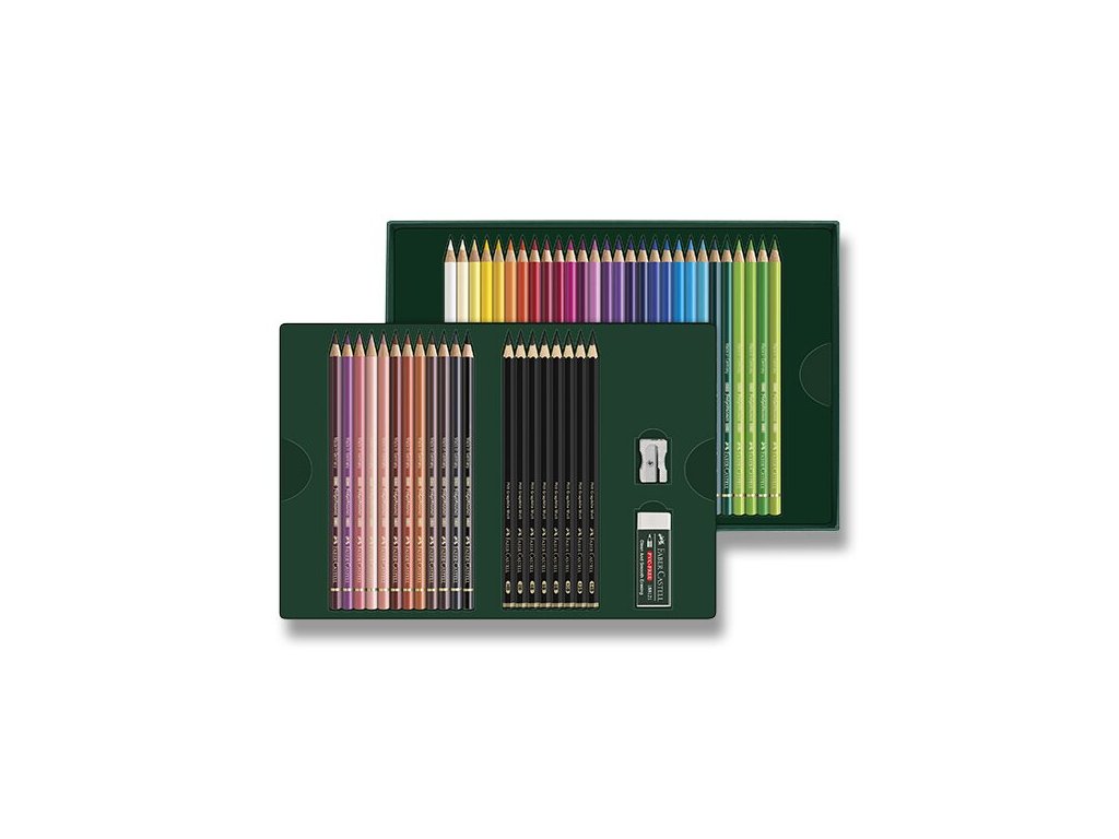 Sada 40 kusů vysoce kvalitních dřevěných uměleckých pastelek Polychromos značky Faber-Castell, 8 ks uměleckých grafitových tužek Pitt Graphite Matt, pryže a ořezávátka.