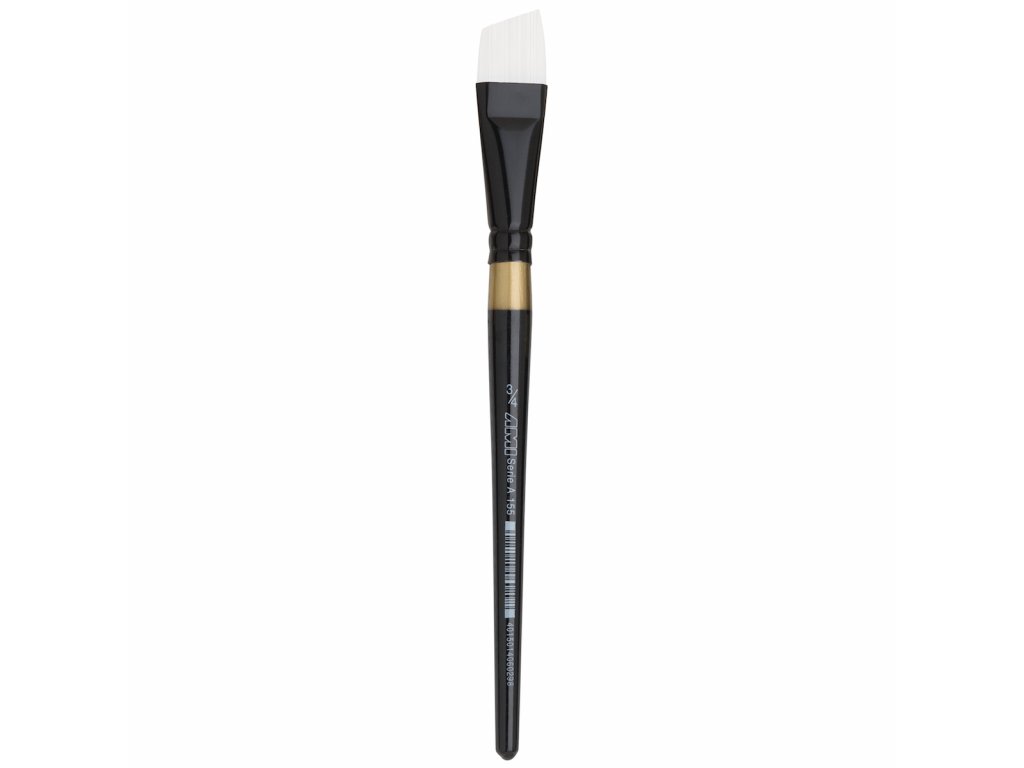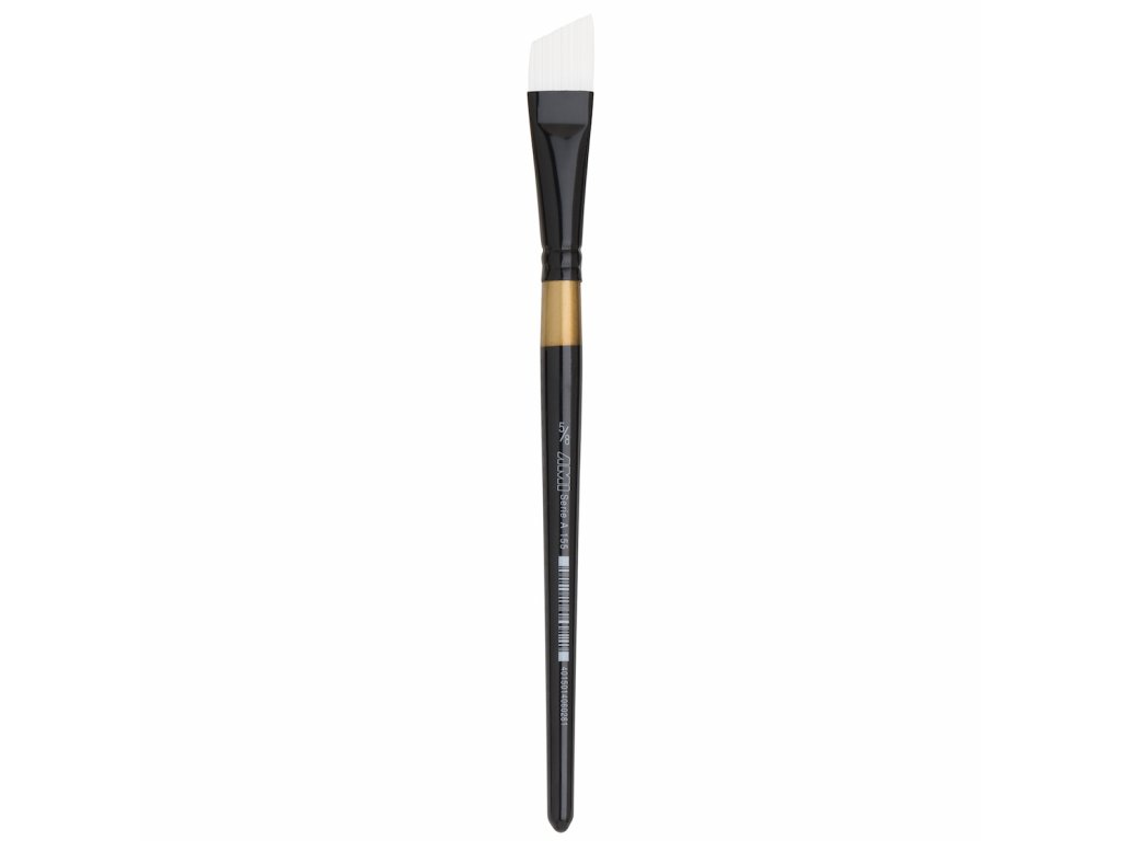 Plochý zkosený štětec řady A155 s bílým syntetickým chlupem a černě lakovanou násadkou se zlatým pruhem, zasazenou v černé bezešvé objímce
