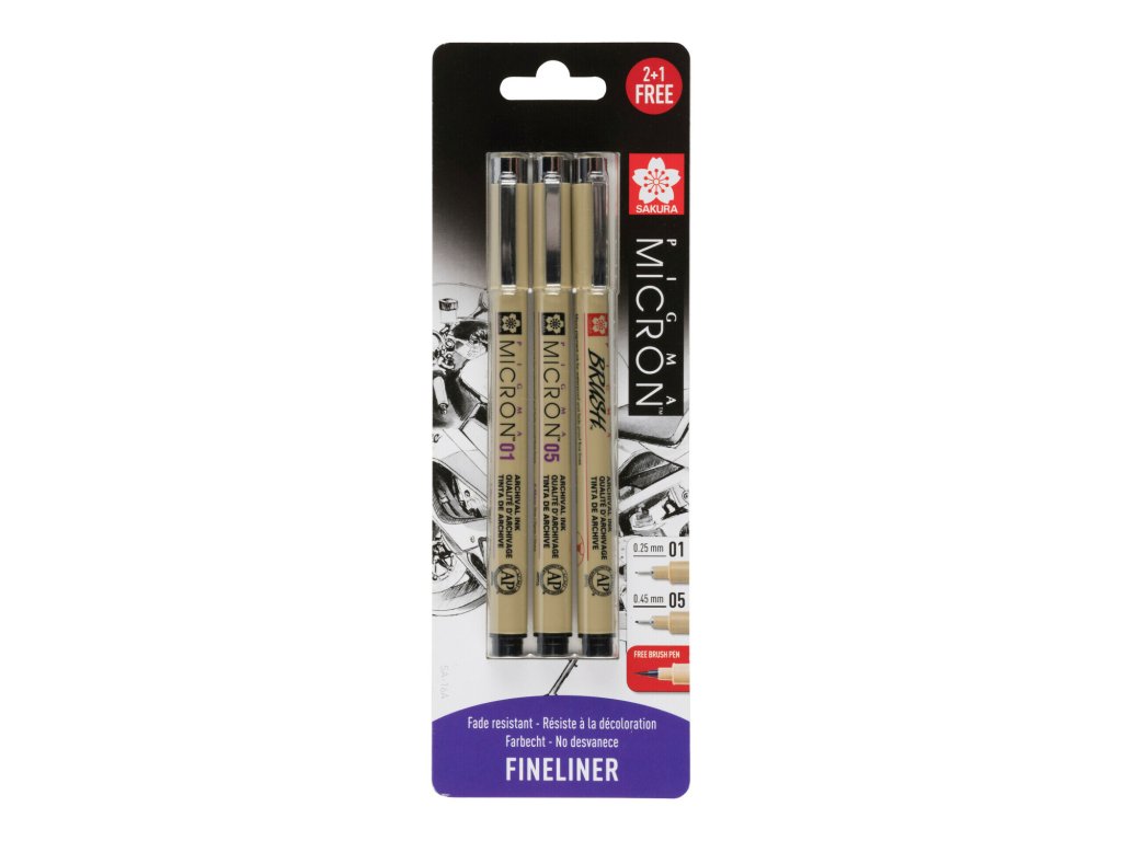 Sada Sakura Pigma Micron, 2+1 Pigma Brush zdarma - v černé barvě, 3 kusy