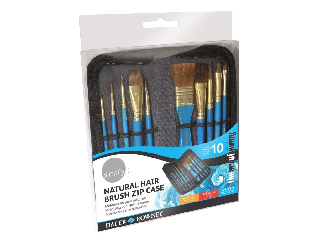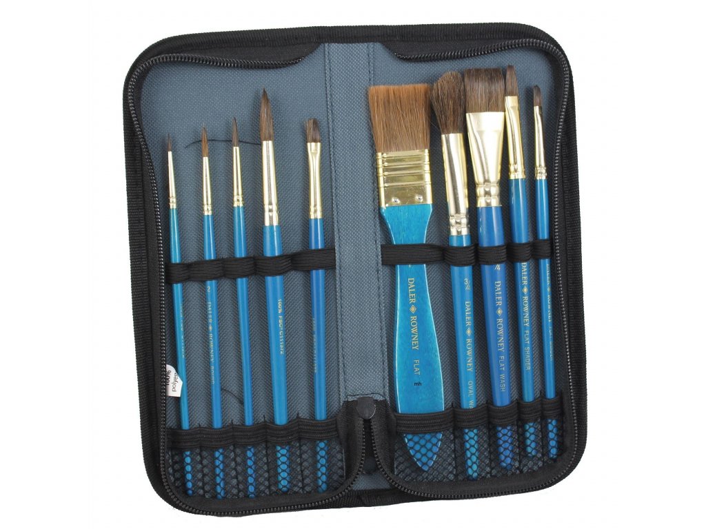 Výběr štětců v penále s krátkou rukojetí nejvyšší kvality s přírodními a syntetickými štětinami různých typů a velikostí, které jsou vhodné zejména pro akvarelovou malbu.