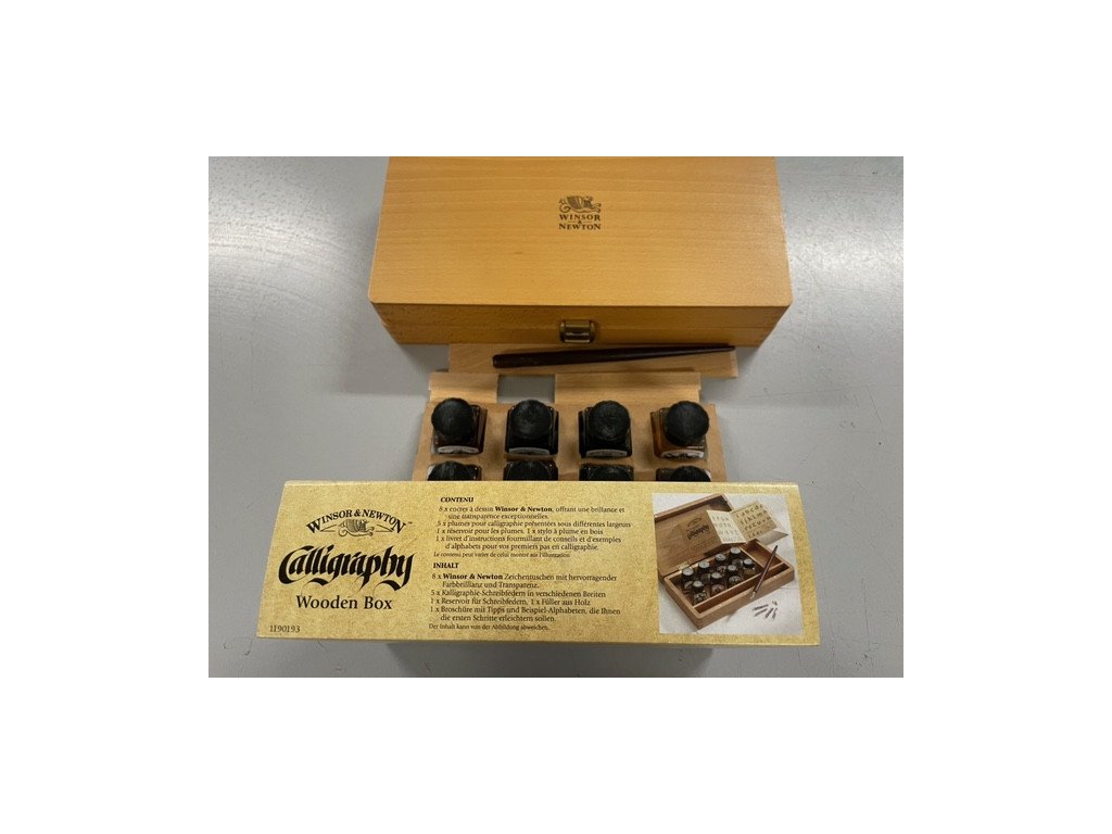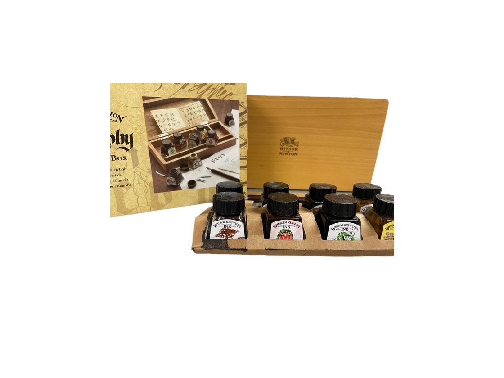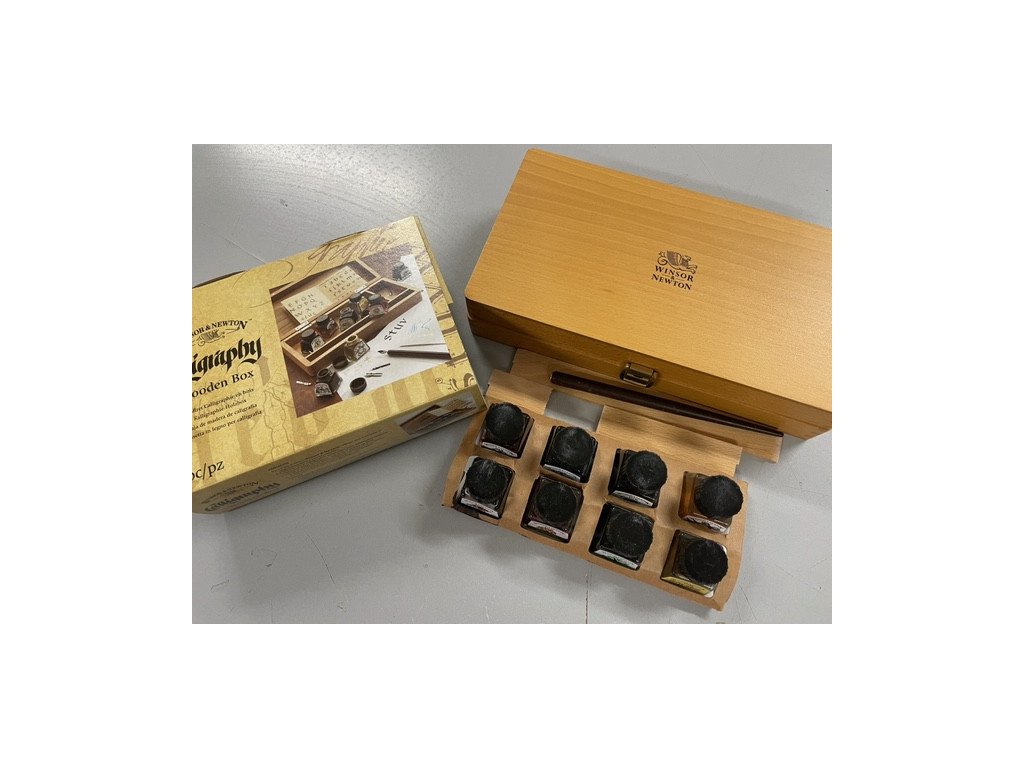 8 ks 14 ml kaligrafických inkoustů - 1 ks lehce ušpiněn 1 násadka5 různých perek 1 kazeta o velikosti 265 / 140 / 550 mm - dopravcem poničená, vnitřní rozdělovníky odlepeny
